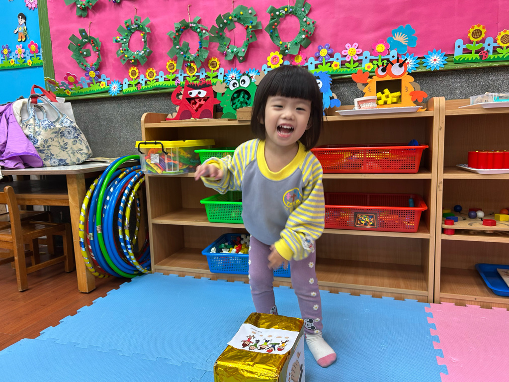聖誕禮物-將每面貼上不同的動作如:拍拍手、飛起來、唱歌、原地跳三下